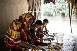 食事をする親子。5歳の男の子(右端)は栄養不良と診断された。母親は基本的な食糧を手に入れることができていない。(バングラデシュ) |