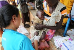 西バハル・アルガザール州ワウで勃発した戦闘から避難してきた親子。国内避難民が身を寄せる避難所では子どもたちの栄養状態の検査や予防接種など、命を守る支援が強化されている。 |