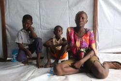 6月24日に突如発生した戦闘から逃れ、弟2人と避難所に身を寄せるネダルくん(15歳)。両親と離れてしまった。(南スーダン・ワウ) |