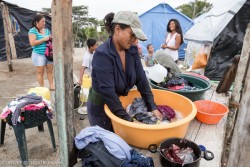 非公式の避難場所に身を寄せ、指定された場所で子どもや孫らと一緒に洗濯をする女性。湿度が高いこの地域では太陽が出ている日中に洗濯を乾かすことに努めている(2016年7月、ラチョレラ) |