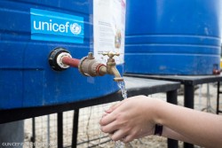 ユニセフが提供した蛇口付き給水タンクの水を利用する避難者。(2016年7月マナビ州) |