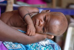 ユニセフが支援する保健センターで、治療を受けている、重度の急性栄養不良の男の子。(ナイジェリア・ボルノ州の避難民キャンプ)※本文との直接の関係はありません。 |
