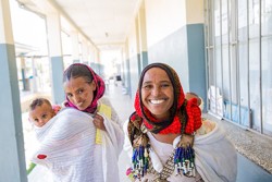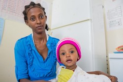 ティグレ州の病院で9カ月の双子ハッセンちゃんとフセインちゃんが予防接種を受けて、喜ぶ母親メルディヤさん(23歳)と祖母マハラさん(50歳)。 |
