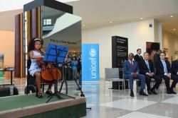 国連本部ロビーに登場したタイムマシーン。式典では国連事務総長らが見守る中、エマーソン・デービスさん(9才)がチェロを演奏。 |