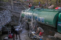 ジェレミー郊外の井戸で水を補給する給水車。これからグランダンス県内の地域やシェルターに水を届ける。 |
