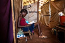 中央アフリカ共和国の国内避難民が身を寄せるキャンプで、本を読む女の子(14歳) |