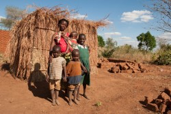 干ばつによる食糧不足の影響を受けるマラウイで、2歳~10歳の子どもと、トウモロコシの皮で作られた家族の住む小屋の前に立つアリナフェさん(マラウイ・バラカ州)。 |