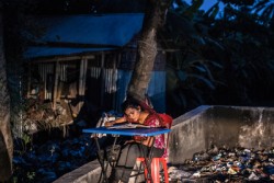 学校から帰った後、母親が拾い集めた物を売るのに使う机で勉強する、ジュマさん(14歳)。8歳で学校をやめ、3年間住み込みのお手伝いとして働いている間は、学校にも行けなかった。(バングラデシュ・クルナ) |