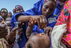 ナイジェリアの国内避難民キャンプにてユニセフ職員からポリオの予防接種を受ける子ども(2016年8月撮影) |