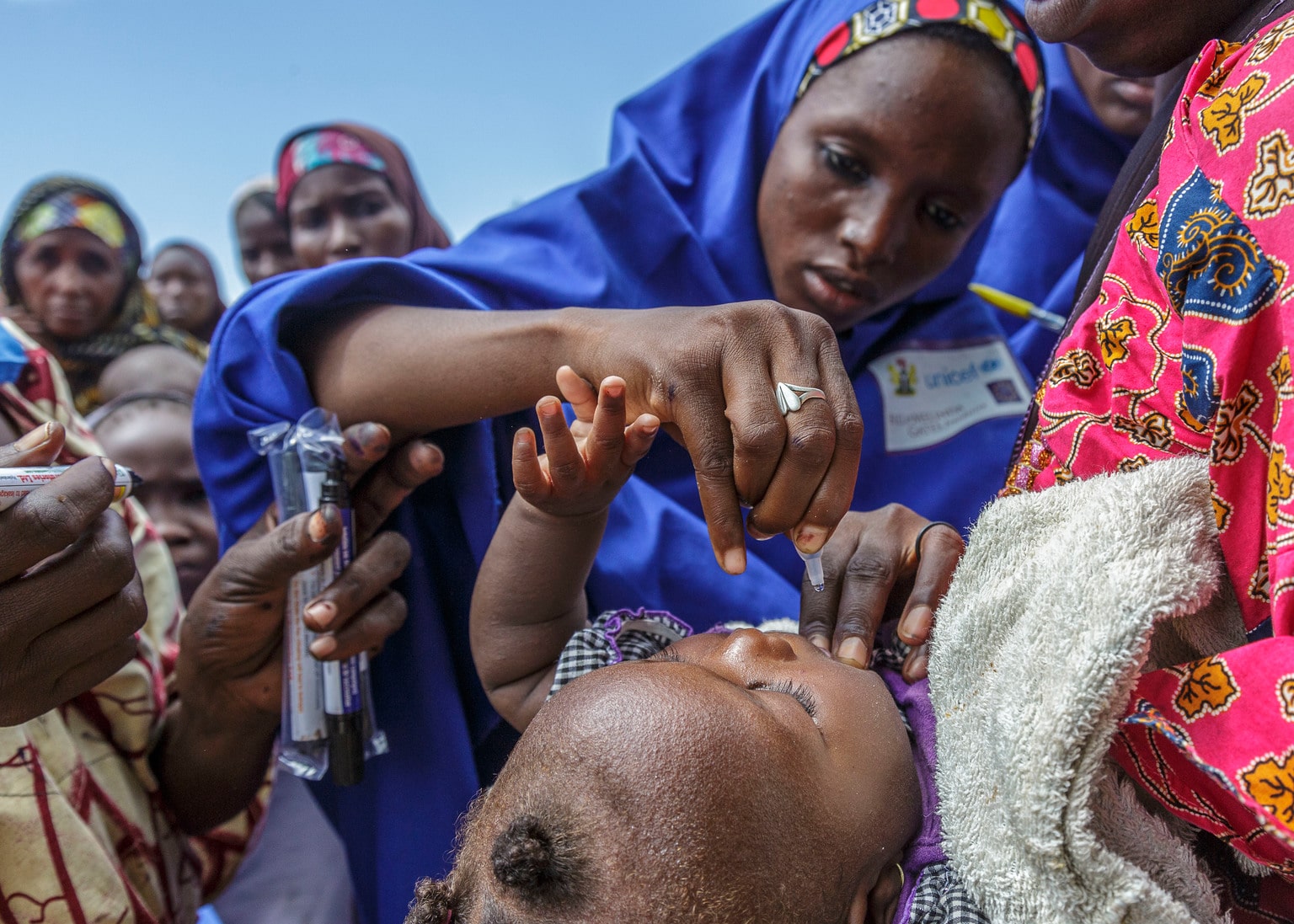 ポリオ根絶への取り組みによる効果は、子どもたちを麻痺から守ることに留まりません。活動に精通した現場の女性保健員たちは、地域の保健システムをより強化する人材となっており、これまで支援が届いていなかった多くの子どもたちも、命を守る保健サービスが受けられるようになっています。ナイジェリア、アフガニスタン、パキスタンでは、ユニセフが支援する地域活動員4万4,376人(その多くが女性)がポリオのみならず、衛生、母乳育児、下痢の予防や治療についての啓発活動を行っています。紛争の影響下にあるナイジェリアのボルノ州では、ポリオ予防接種キャンペーンを利用して、特に命の危機にある子どもを見つけ出したり、栄養治療食を配布する活動もおこなっています。