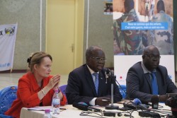閉会後の記者会見。 左からMINUSCA職員、武装解除・動員解除・社会復帰(DDR)相, ユニセフの子どもの保護チーフ |