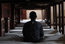 バンギにある、ユニセフが支援する保護センターで暮らすポールくん(14歳、仮名)。武装グループから逃げ出し、400kmもの道のりを歩いてバンギにたどり着いた。この保護センターでは子どもたちに、衣食住はもとより、保健ケアや教育支援も提供している。 |