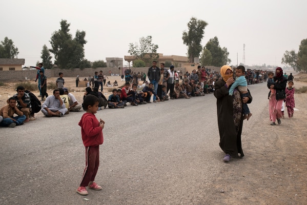 緊急支援物資を受け取るために並ぶ、モスル南部より避難してきた家族(2016年10月24日撮影) |
