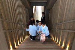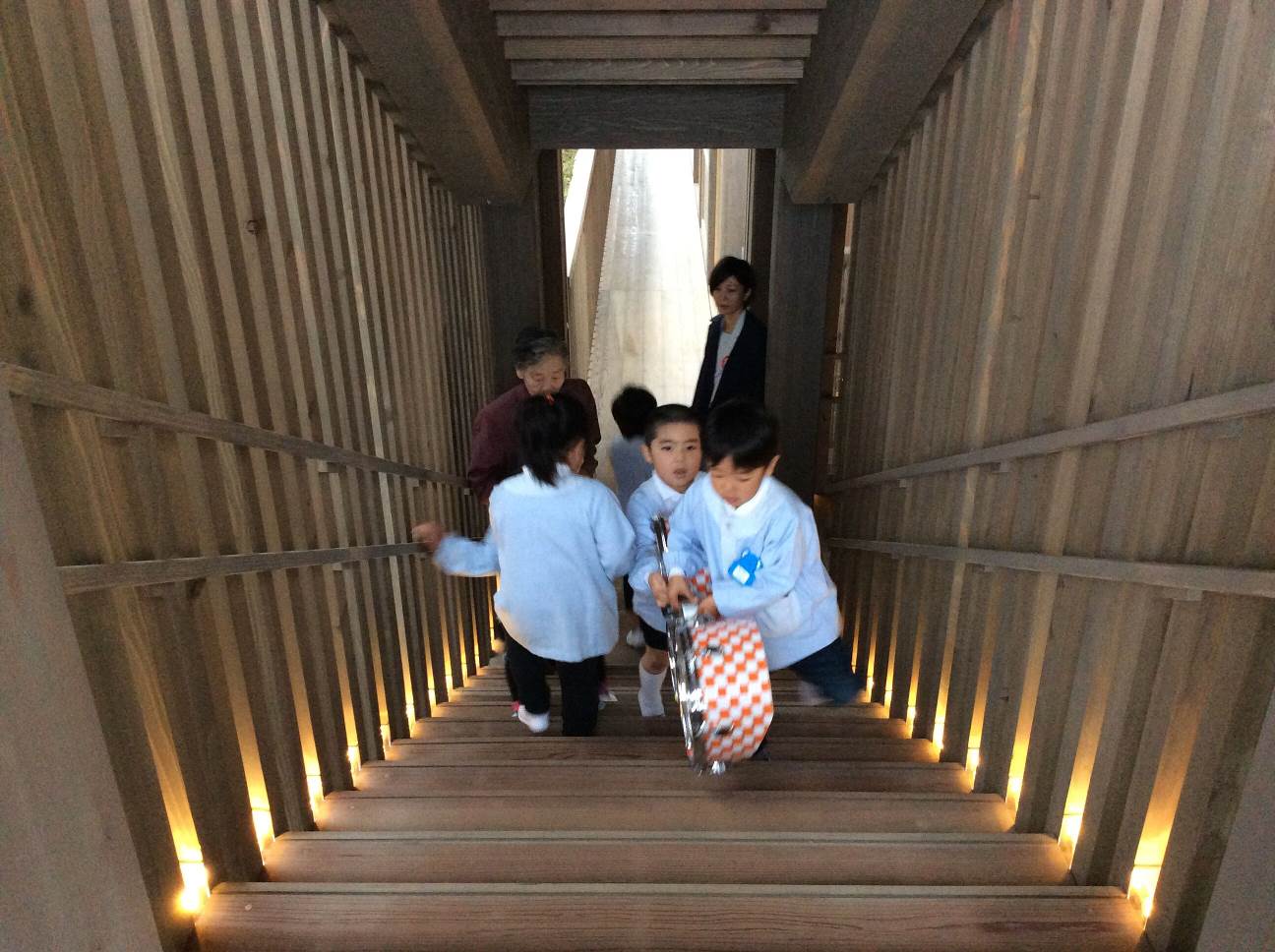 最後に園児たちから、鼓笛演奏と元気いっぱいの歌のお披露目がありました。夕方から冷たい雨が降る寒い一日でしたが、この日初めて新しい園舎に入った子どもたちは、縁側を走り回り、木の温もりあふれる床をゴロゴロと寝転んだり、山の斜面に作られた建物をつなぐ階段を上ったり下りたりと、元気いっぱい動き回っていました。