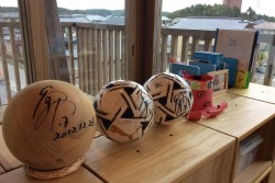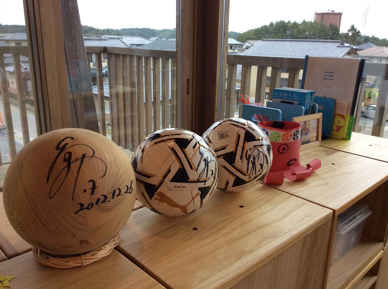 園の一角に設けられた「長谷部選手コーナー」。長谷部選手は、震災が起きた2011年から毎年、公民館やプレハブ園舎で不自由な幼稚園生活を送っていた子どもたちに、「元気」を届けてくれました。ボールの右側の「紙製のタコ」も、長谷部選手の“作品”。 |