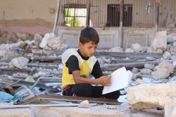シリアで避難民シェルターとなった学校に滞在する男の子。 |