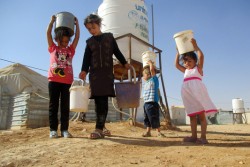 シリアとの国境に近い、ヨルダンのザータリ難民キャンプにて水を汲む子どもたち。 |