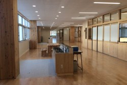 大槌学園には、「ふるさと科」という授業があります。郷土愛や生きる力、災害時の判断力や実践力を育てるために、地域の方を講師にした授業を行っているそうです。体育館の一角には、「ふるさと科」を運営される地域の方が常駐する「いどばた会議室」もあり、日常的に地域と学園をつないでいます。地元産の木の香りに包まれたぬくもりあふれる新しい学校は、地域の方々の力も借りながら、復興への取り組みが続く町で子どもたちを見守り、育てていきます。