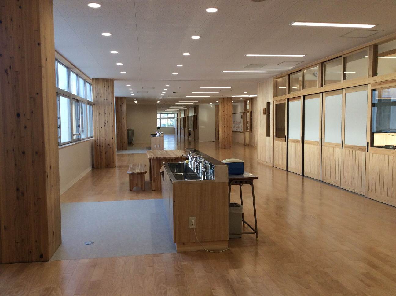 各教室の前には、洗い場も備えた広い廊下が広がります。教室との境の引き戸を全開にすれば、巨大なワークスペースに。「教室以外の休憩・交流・活動スペース」「避難所として使いやすい教室」を提案する子どもたちのアイディアを元に設計されました。 |