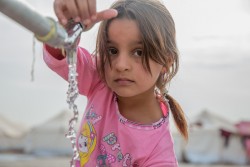 避難民キャンプで水を汲む、モスルから逃れてきた女の子。(2016年11月15日撮影) |