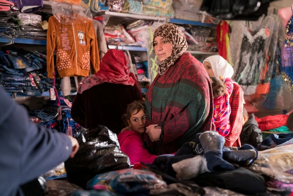 一時給付された現金を使い、ザータリ難民キャンプ内の店で子どもの服を買う母親。(2016年12月1日) |