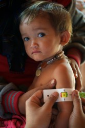 栄養状態の確認のため、上腕の測定を受けるラオスの男の子。 |