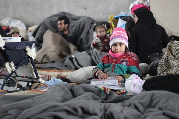 アレッポ東部で続く戦闘から逃れるため、ジブリーン市にある大型倉庫で避難生活を送る家族が多くいる。(2016年12月7日撮影) |