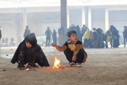 厳しい寒さから、たき火の回りに集まる男の子たち。倉庫の周りにある燃やせそうなものを全て集め、火にくべている。(2016年12月1日撮影) |