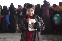 ユニセフより支給された高カロリービスケットを抱え笑顔を見せる、ジブリーン市の倉庫に避難する男の子。(2016年12月7日撮影) |