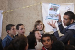 ジブリーン市にある避難シェルターで、ボランティアによる地雷についての講習を見学する、ユニセフ・シリア代表のハナア・シンガー。(2016年12月3日撮影) |