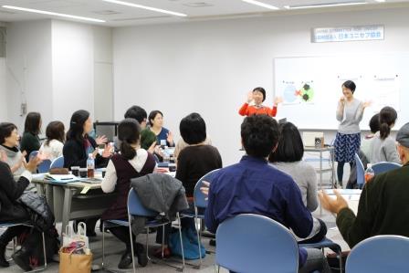 避難所などに子どもが安心して遊び、学べるスペースを確保する「子どもにやさしい空間」をはじめ、遊びなどを通じて子どもたちに心のケアを提供する活動は、東日本大震災の現場で多くの支援団体や専門家団体が実践し、現在も平成28年熊本地震の被災地や福島県からの自主避難者を支援されている団体などで続けられています。日本ユニセフ協会は、「子どもにやさしい空間」をはじめとする様々な形態の子どもの心のケア支援の手法と理論を、国内外の災害支援の第一線で活躍する専門家や子ども支援に関わる方々に学んでいただく研修会を、東京都港区のユニセフハウスで開催しました。
