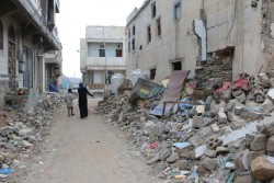 内戦で破壊された町並みを歩くファハドくん(10歳)。ファハドくんと家族は、自宅とすべての所持品を失いました。 |