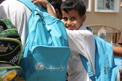学用品が詰まったユニセフのスクールバッグが、教育支援の一環としてイエメンの子どもたちに提供されている。 |