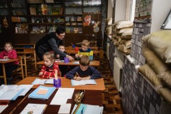 学校の授業風景。窓脇には砂袋が積まれている。(ウクライナ・ドネツク州) |