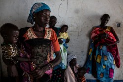 南スーダン北部の村で、移動式クリニックを訪れ、子どもの健康状態のチェックを待つ女性たち。 |