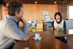日本ユニセフ協会が再建を支援した「あさひ幼稚園」(宮城県南三陸町)の先生方から、ユニセフの支援が園や子どもたち、地域にもたらした効果(インパクト)を聞き取るユニセフ本部のエドゥアルド・ガルシア・ローランドECD専門官。(写真左) |