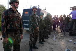 ハンガリーの公式な国境検問所以外からの入国を防ぐ警察と軍(2015年9月撮影) |