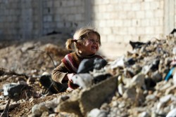 瓦礫の中笑顔を見せるシリアの女の子 |