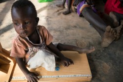 栄養不良の検査の一環で、身長測定をする男の子(南スーダン・アウェル)2017年3月13日撮影 |