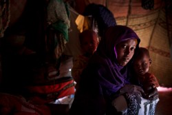インフルエンザと下痢に苦しむ2人の子どもたちと母親(ソマリア・ブラオ)2017年3月8日撮影 |