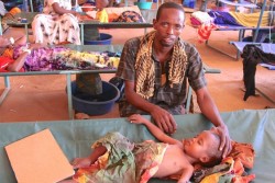 病院で水様性下痢の治療を受ける子どもと、付き添う父親(ソマリア・バイドア)2017年3月15日撮影 |