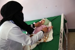 イエメン・サヌアのアル・サビン病院で、診察を受ける1歳のカウラちゃん。生後4カ月の時から治療を受けている。 |