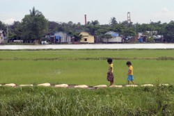 孤児院ツーリズムが盛んなミャンマー・ダラの田んぼを歩く子どもたち。 |