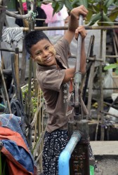 家の外にあるパイプ式井戸で水を汲むアカルくん |