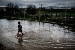 寒い中、難民キャンプで水遊びをする男の子(ギリシャ・ハルキス)2017年3月10日撮影 |