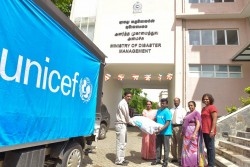 洪水の影響を受ける地域のため、支援物資を届けるユニセフ(スリランカ・コロンボ) 2017年5月29日撮影 |