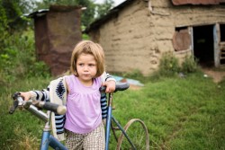 タイヤのない古い自転車で遊ぶ4歳の女の子 (ルーマニア)2016年8月撮影 |
