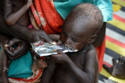 ユニセフが支援する外来治療センターで、すぐに食べられる栄養治療食(RUTF)を食べる子ども(南スーダン) |