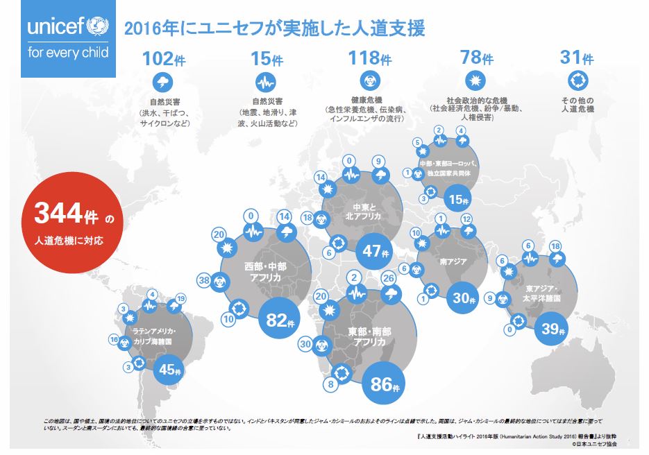 2016年にユニセフが実施した人道支援 ※クリックで拡大してご覧いただけます。 |