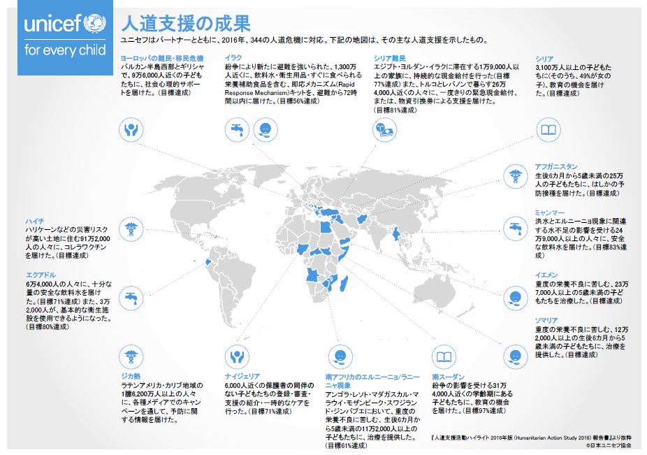 ユニセフの人道支援の成果(2016年) ※クリックで拡大してご覧いただけます。 |